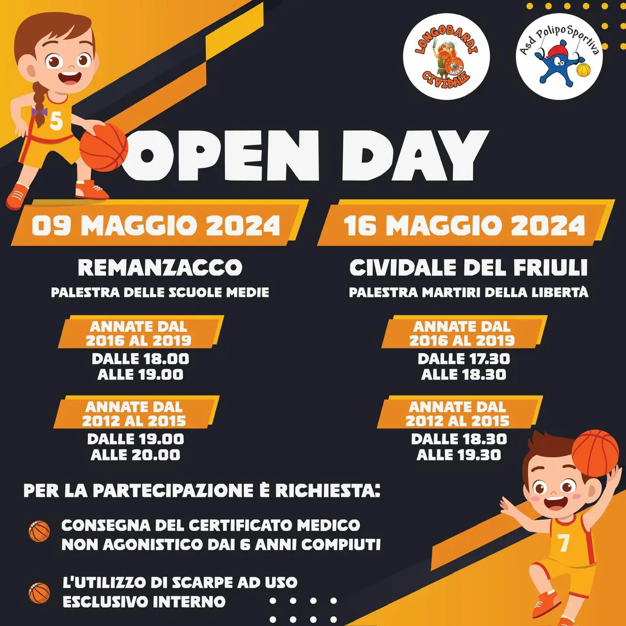 La Longobardi Basket Cividale, in collaborazione con la PolipoSportiva Premariacco - Remanzacco, organizza nuovamente gli open days di primavera per le attività di minibasket, aperte a tutti i bambini e bambine delle annate dal 2012 al 2019 comprese!