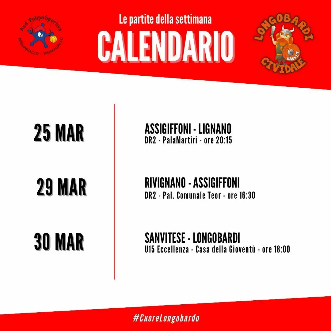 Gli esordienti dei Longobardi scenderanno in campo martedì 25 marzo alle 19:00 contro Codroipo presso la Palestra della Scuola di Remanzacco. Torneranno in campo venerdì 28 marzo alle 17:45 contro Rivignano presso la Palestra Comunale di Rivignano.