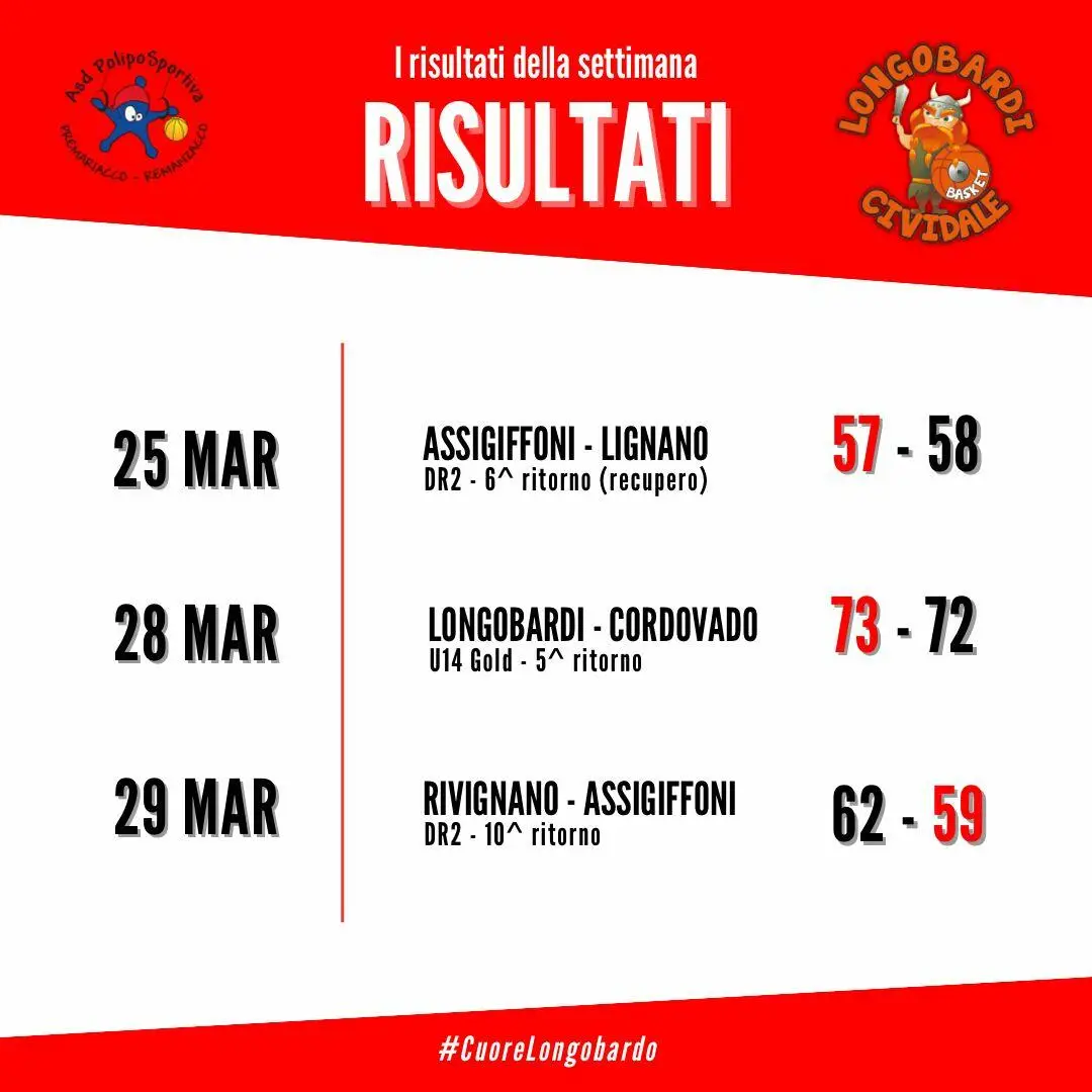 I longobardi, guidati da coach Tiziano Lorenzon e dalla sua vice Arianna Cortolezzis, vincono contro il Basket Cordovado nella sedicesima giornata di campionato per 73-72 (20-17, 26-11, 8-31, 19-13). Tabellini: Predan 14, Bulfoni 5, Pettarin, Lisetto 10, Macor, Miguel Abdala, Zorzutto 6, Piccoli 2, Sartori, Terpich 25, Poboni 11.