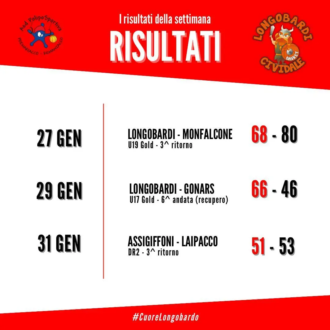 Vittoria nel recupero della sesta giornata di campionato della compagine longobarda, guidata da coach Giacomo Genero e dal vice Luca Vogrig, contro il Libertas Gonars per 66-46 (14-16, 21-14, 14-7, 17-9). Tabellini: Manin 22, Motta 5, Scolz 4, Raimondi 4, Antonutti 20, Ceccutti 0, Specogna 1, Iacolettig 0, Fanna 4, Lisetto 2, Ramadani 4.