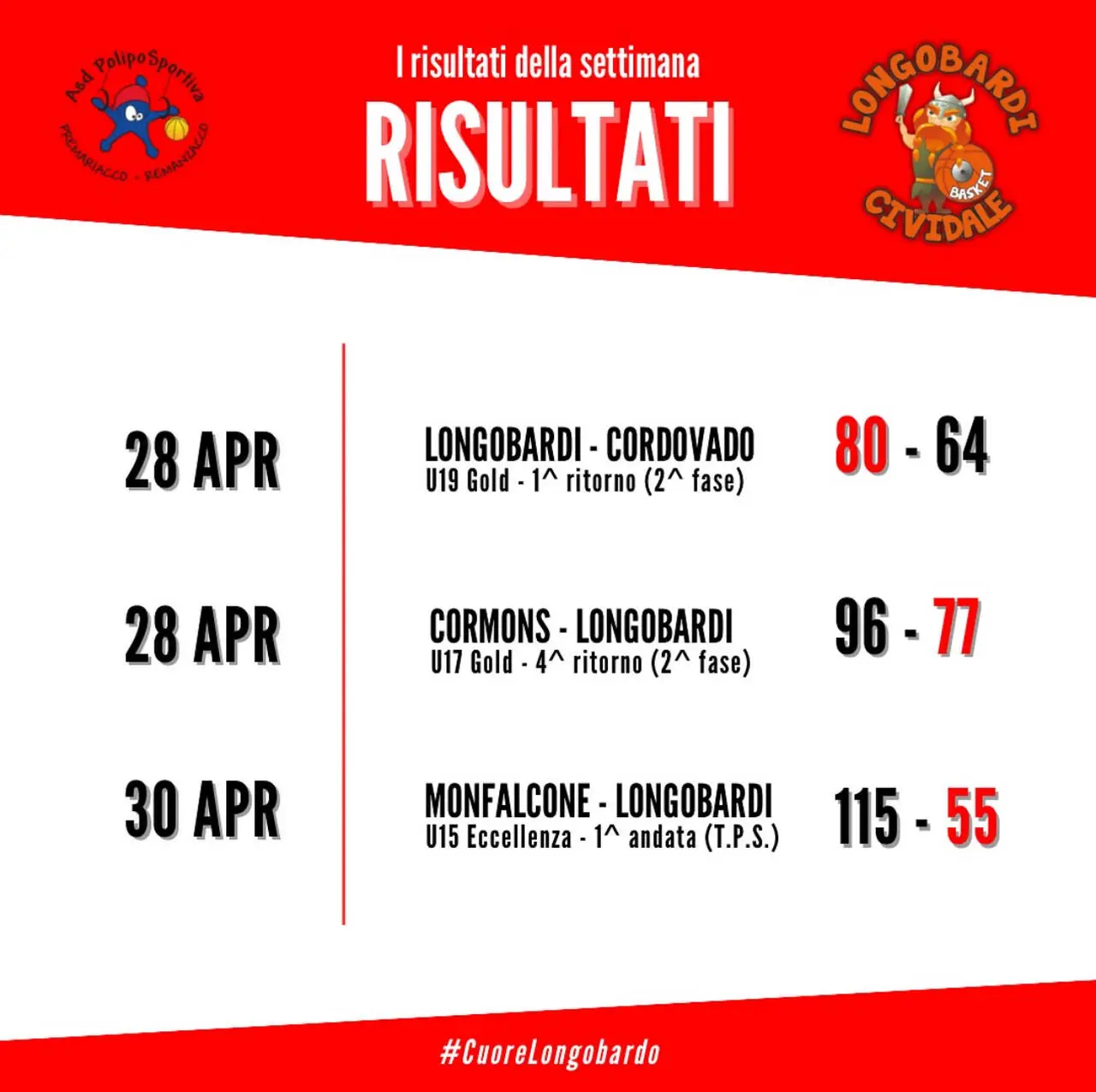 Sconfitta nella quarta giornata di ritorno della seconda fase di campionato della compagine longobarda, guidata da coach Giacomo Genero e dal vice Luca Vogrig, contro Cormons per 96-77 (25-18, 18-25, 25-21, 28-13). Tabellini: Iacolettig 15, Ceccutti n.e., Motta 8, Ramadani 6, Cipriani 2, Lisetto 6, Bartolini 4, Antonutti 20, Menta 10, Manin 4, Scolz 2, Rai 0.